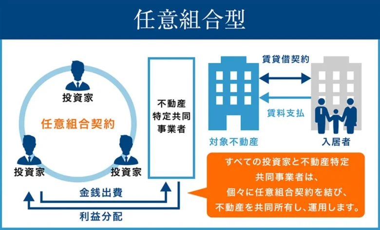「任意組合型」とは、複数の投資家の間で任意組合契約を結んで出資を行う方式です。つまり、不動産クラウドファンディングの事業者と複数の投資家が共同で不動産を所有・運営することになります。そこで得られた利益が組合契約者(組合員)へ分配されるという仕組みです。