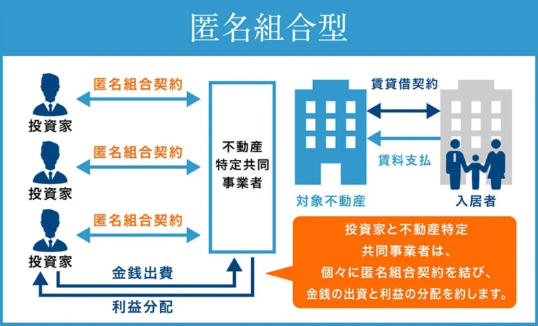 「匿名組合型」とは、投資家と事業者が個々に匿名組合契約を結び、出資を受けた事業者が主体となり事業を運営する仕組みです。不動産の所有権は事業者になります。そのため、投資家である出資者が物件の名義人になることはありません。