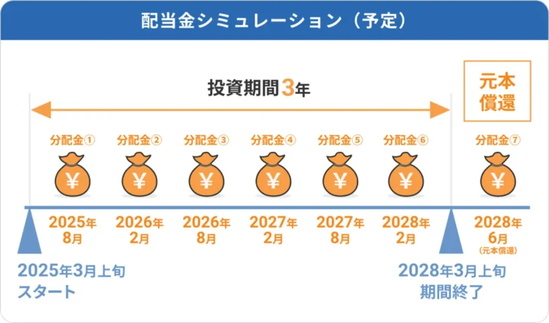 投資期間は3年間です。運用期間中に分配金が定期的に支払われ、元本償還時にも分配金を受け取ることができます。