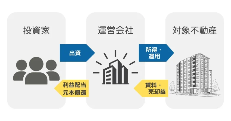 家賃収入(インカムゲイン)や売却益(キャピタルゲイン)からでた利益が、出資額に応じて投資家へ分配されます。