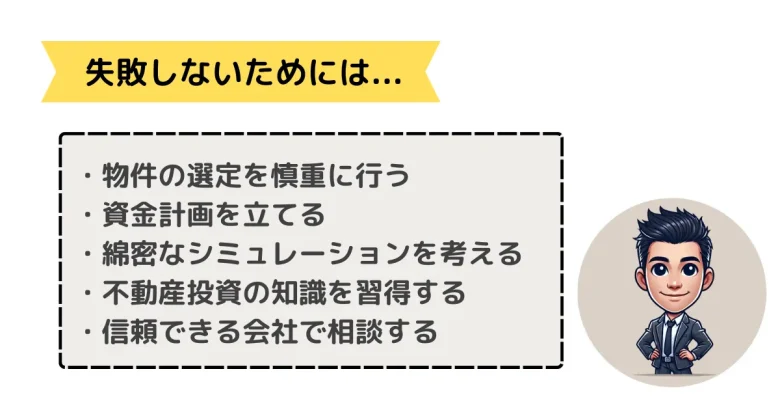 Aさんの失敗要因は、業者の営業トークをうのみにしたことです。「節税効果で実質負担はゼロ」「将来の年金代わりになる」という説明を信じ、詳細な収支シミュレーションを行わずに購入を決断しました。
